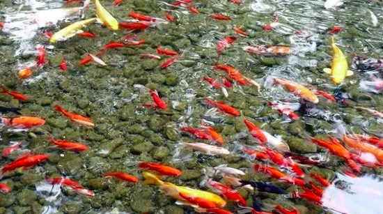 泰山花海桃花溪里有个梦鲤池,梦鲤池里养了许多鲤鱼,有: