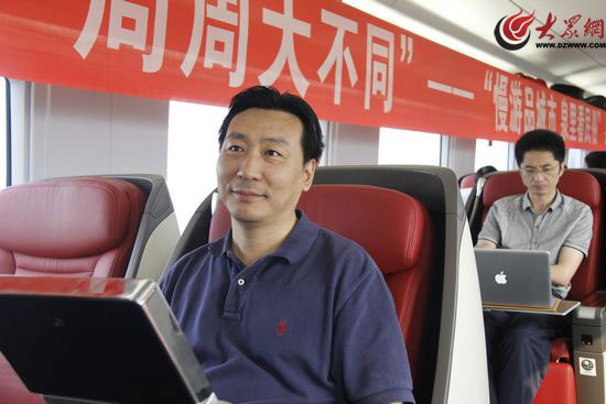 ▲省旅游局局长于冲在时速300公里的高铁上推荐山东旅游。 记者 乔显佳 摄