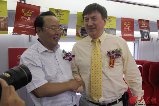 “好客山东欢迎您!”6日早晨7时许,说这句话的是山东省旅游局局长于冲,讲话的地点不是封闭的会议室,而是以时速300公里“陆地飞行”的京沪高铁上。